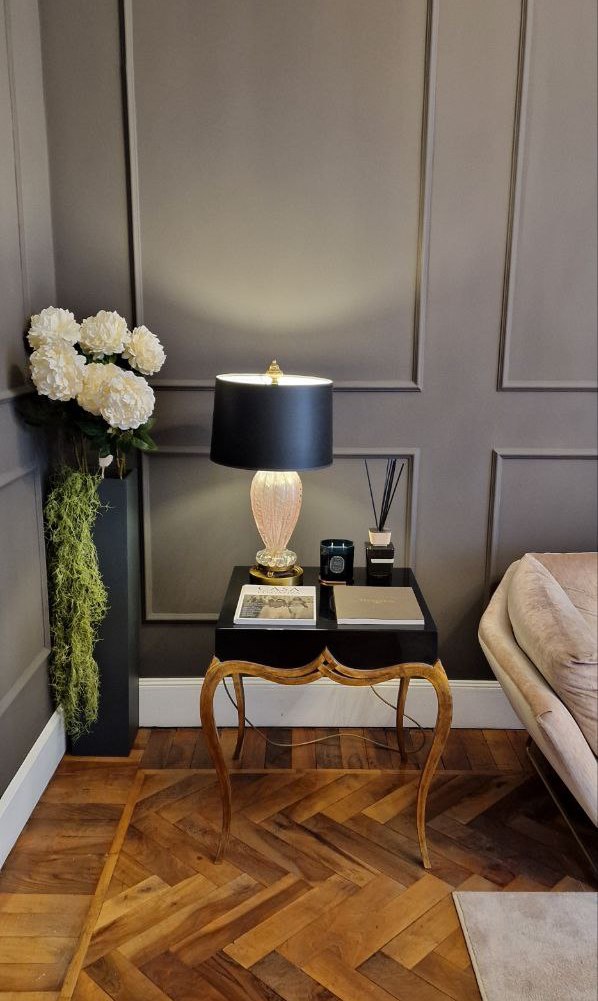 Un tavolo minimale in una stanza con pavimenti importanti e decori originali, un pezzo classico rivisitato per sdrammatizzare, un quadro grande appoggiato a terra, una lampada di design e dei vuoti…spazi vuoti strategici che fanno riposare lo sguardo e rappresentano il contorno alla scenografia.
